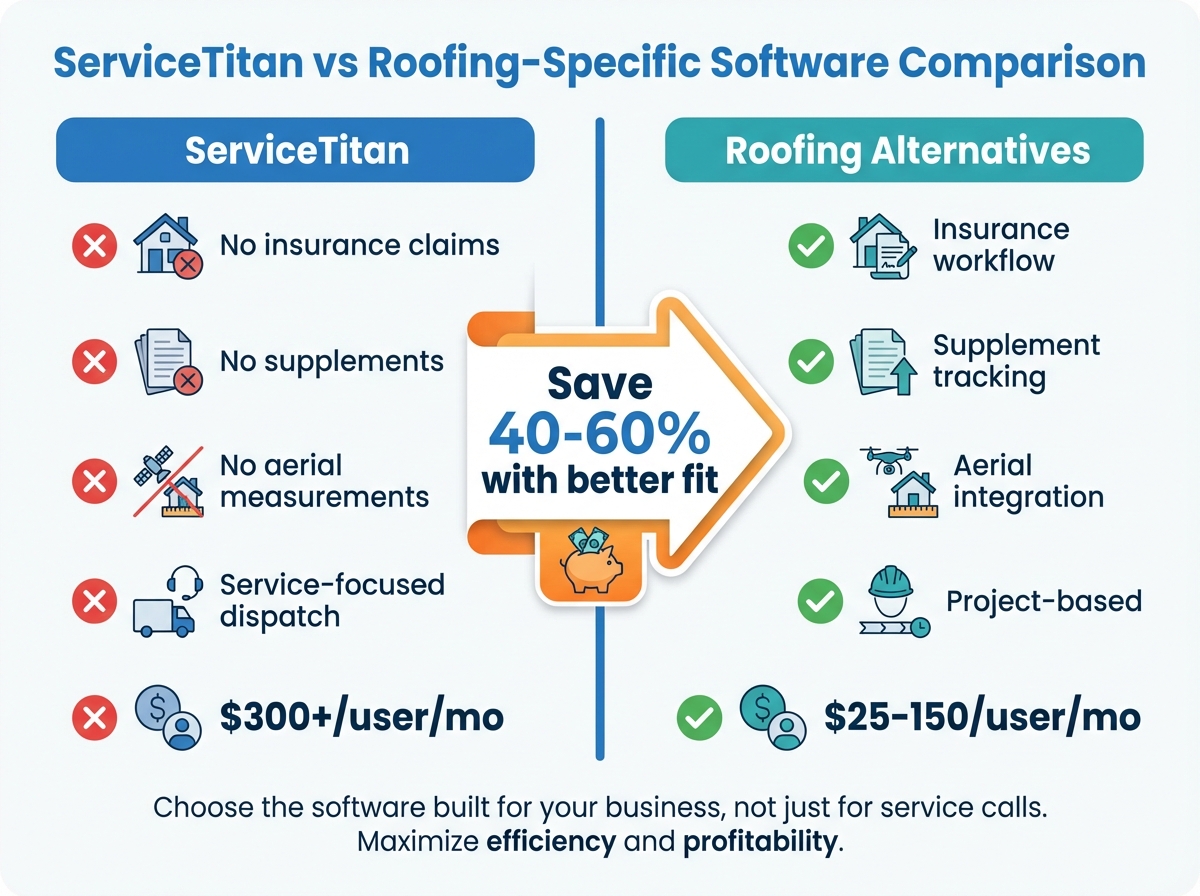 - ServiceTitan costs 40-60% more than roofing alternatives with worse feature fit