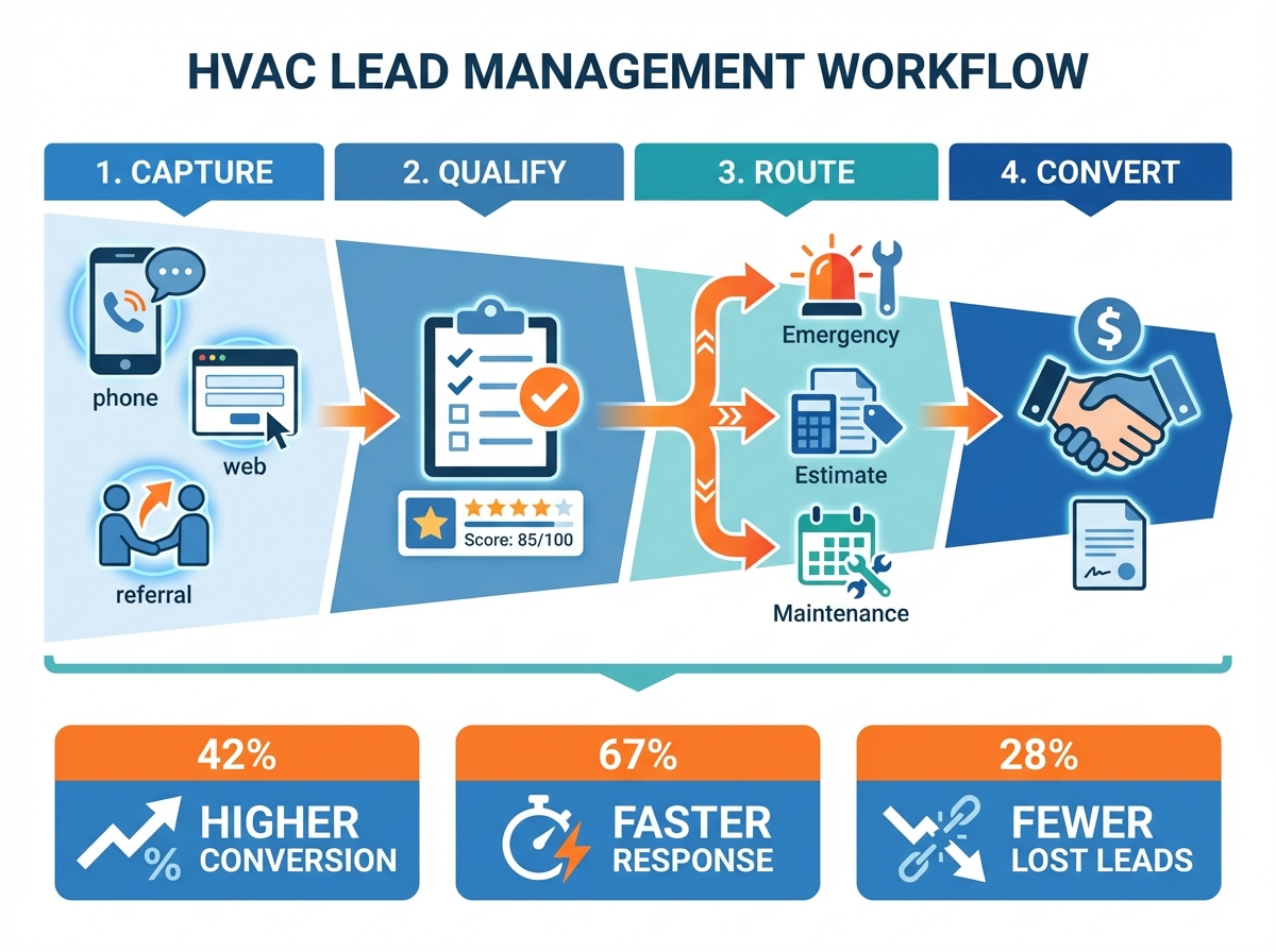 HVAC companies with structured lead management convert 35-45% of qualified leads versus 15-20% for those managing leads informally.