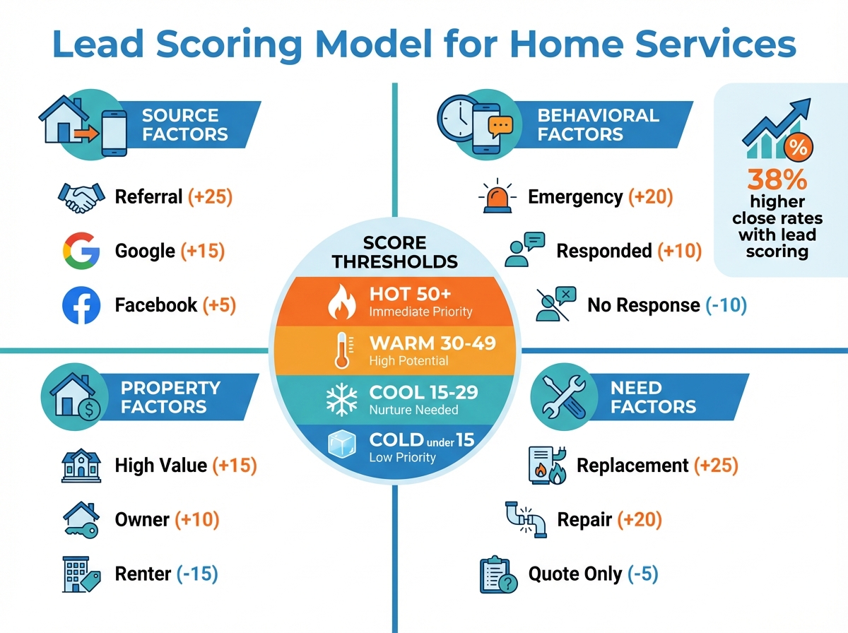 TL;DR: Lead scoring assigns point values to lead characteristics that predict conversion, allowing home service companies to prioritize the opportunities most likely to close at the highest values. Companies using lead scoring report 38% higher close rates, 27% faster response times to high-value leads, and 45% better sales team productivity by focusing effort where it matters most.