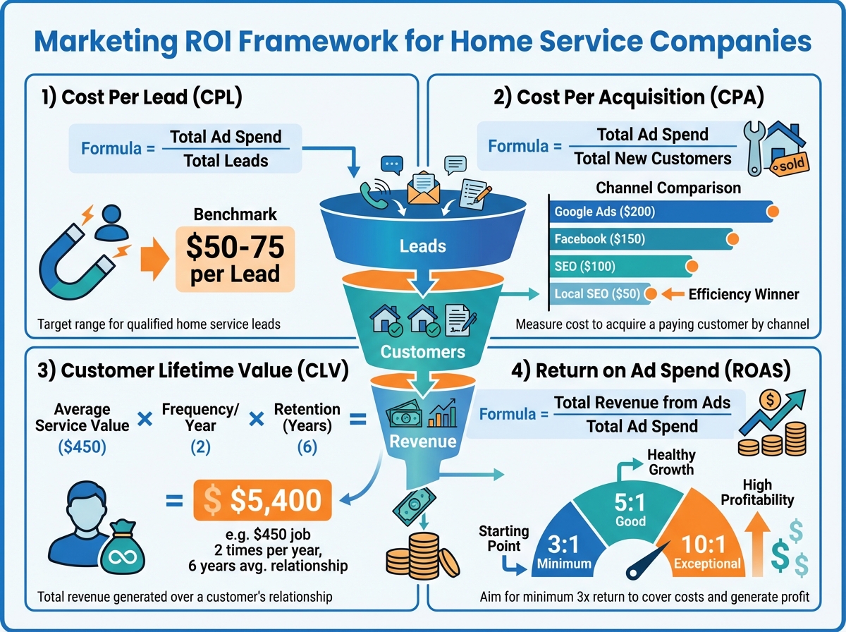 TL;DR: Marketing ROI for home service companies requires tracking four key metrics: cost per lead (CPL), cost per acquisition (CPA), customer lifetime value (CLV), and return on ad spend (ROAS). Most contractors find 30-50% of their marketing spend goes to channels with negative ROI. Proper tracking typically reveals 2-3 channels worth doubling down on and 2-3 worth cutting entirely.