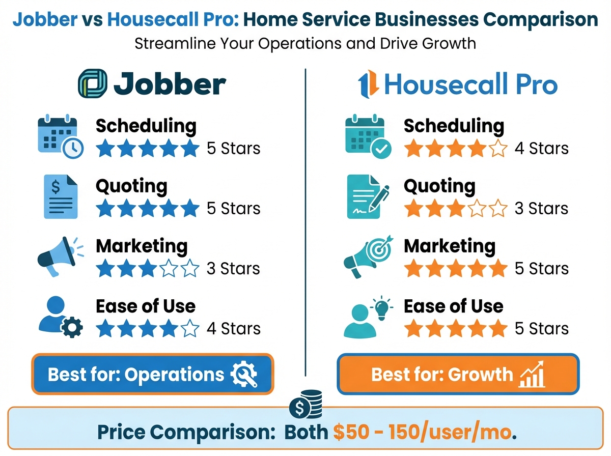 TL;DR: Jobber excels at scheduling, quoting, and job management with a cleaner interface, making it ideal for businesses prioritizing operational efficiency. Housecall Pro offers stronger marketing features, online booking, and a flatter learning curve, making it better for customer-acquisition-focused businesses. Pricing is similar ($50-150/user/month), but value depends on which features matter most for your workflow.